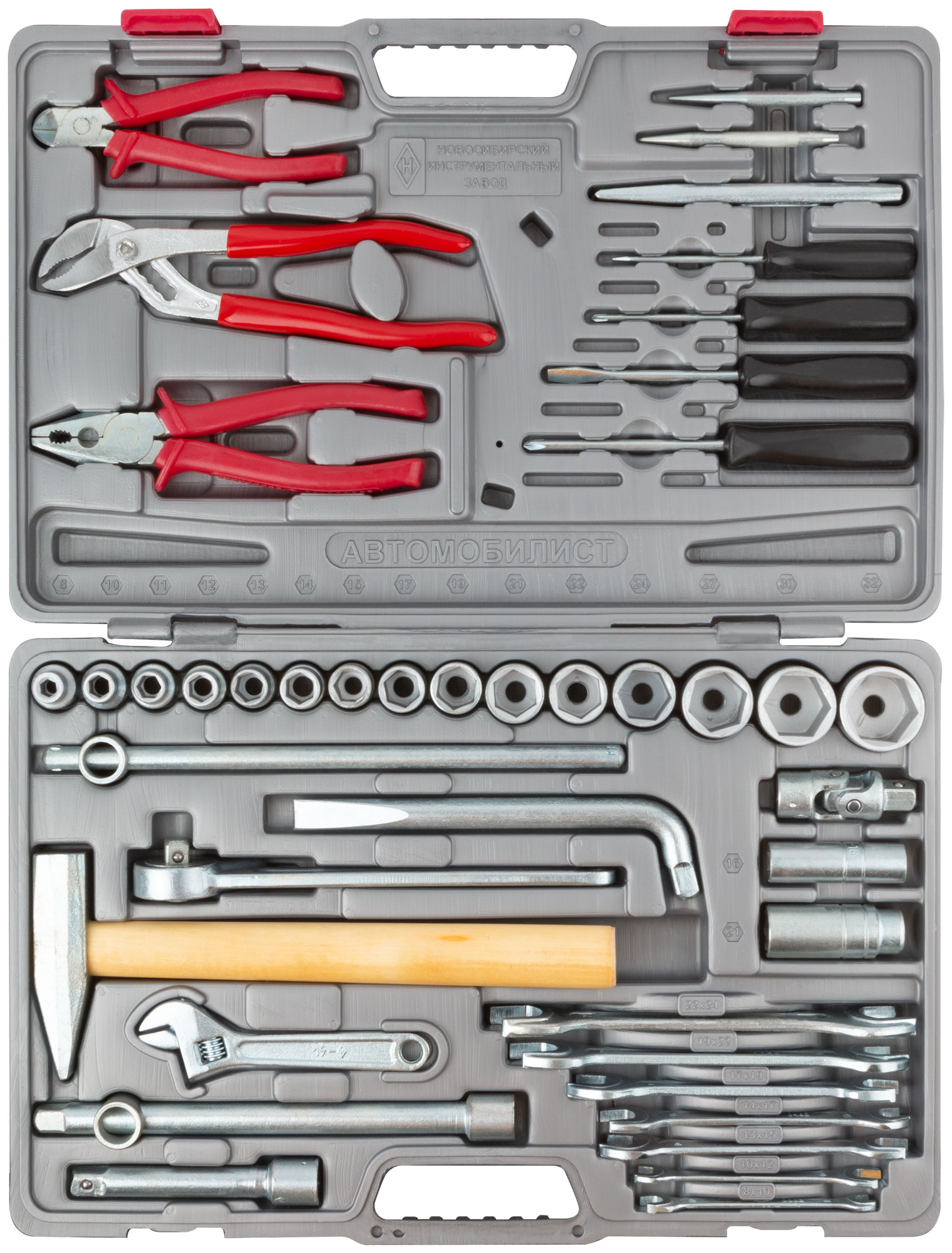 Слесарно-автомобильный. Комплектация: головки шестигранные 1/2” 8-10-11-12-13-14-15-17-19-21-22-24-27-30-32, ключи рожковые 8х10-10х12-13х15-14х17-17х19-19х22-22х24, ключ разводной 19 мм, вороток-рычаг с присоединительным квадратом 1/2” х 300 мм, вороток-рычаг l-образный с лопаткой с присоединительным квадратом 1/2”, вороток трещоточный 1/2” х 250 мм, бородок, удлинитель 1/2” х 150 мм, удлинитель 1/2” х 250 мм. Материал: износоустойчивая конструкционная легированная сталь. Упаковка: пластиковый чемодан.